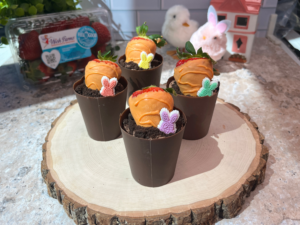 These adorable carrot-inspired treats are a fun and festive Easter dessert, featuring rich chocolate mousse, cookie “dirt,” and a sweet strawberry topper!