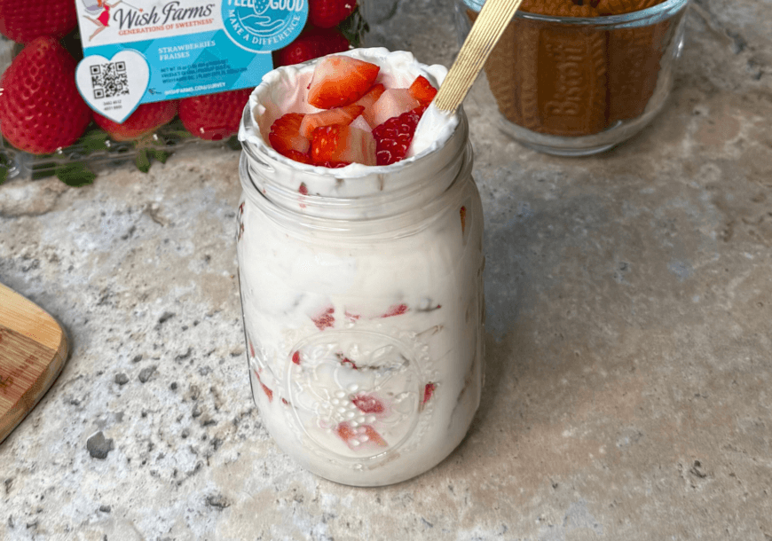 - Add yogurt to a mason jar, then add Biscoff cookies to the jar.