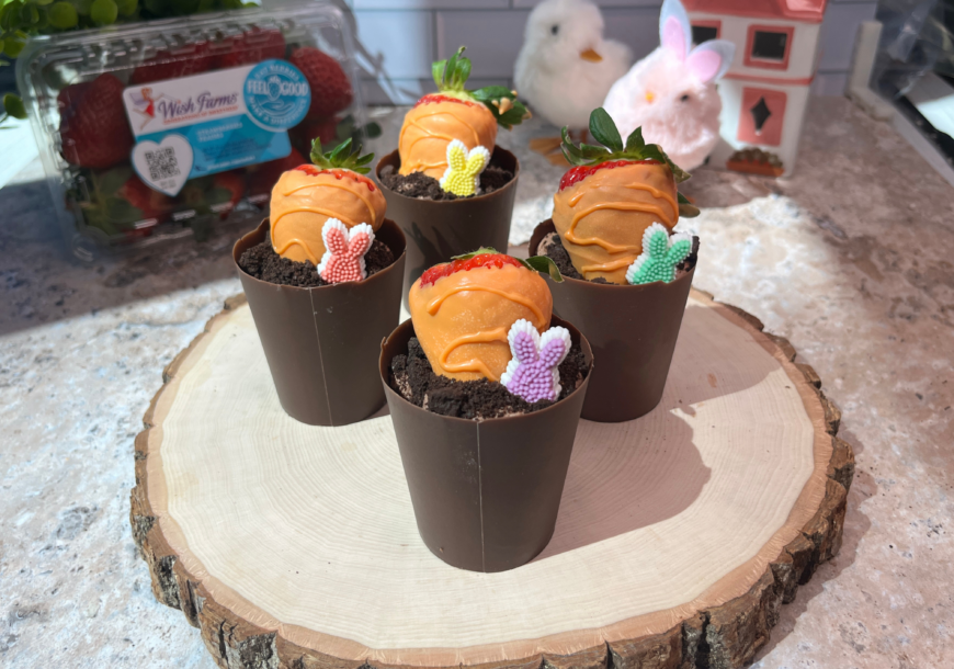 Top each cup with an orange-coated strawberry to resemble a carrot.